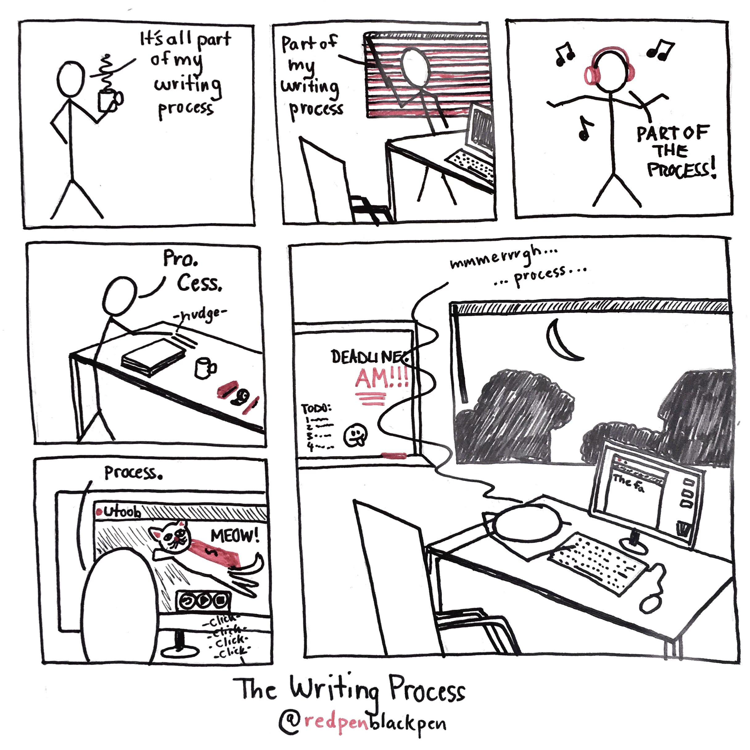 This is a comic I drew in 2016 prompted by the pain of knowing you need to write something (paper, grant, report, whatever) and there’s a deadline but you just … can’t … get motivated to actually sit and write. You’ll pretty much do anything else as part of your “process” to get things going. The point of the comic is that this is all procrastination - pure procrastination. But you can tell yourself there’s a process, sure.